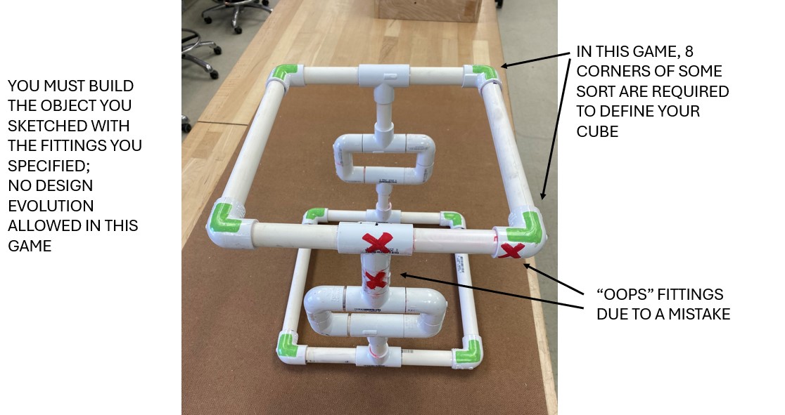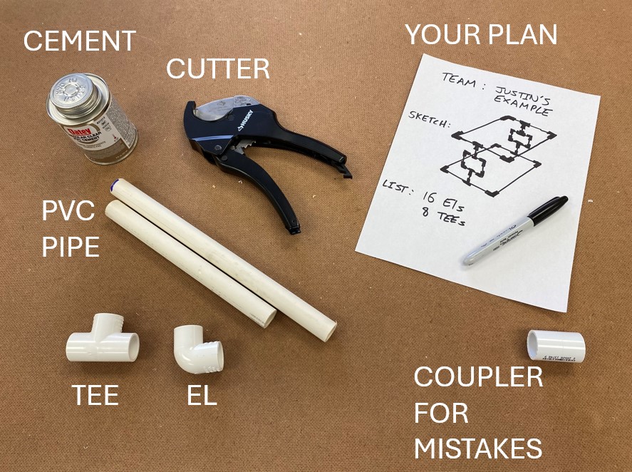 You will work in teams of two to construct a marine vessel and determine how much flotation the vessel needs to make it nearly-neutrally buoyant (an ideal condition for your future ROV). Your marine vessel is a roughly-cube-shaped frame of PVC, as shown in Fig.