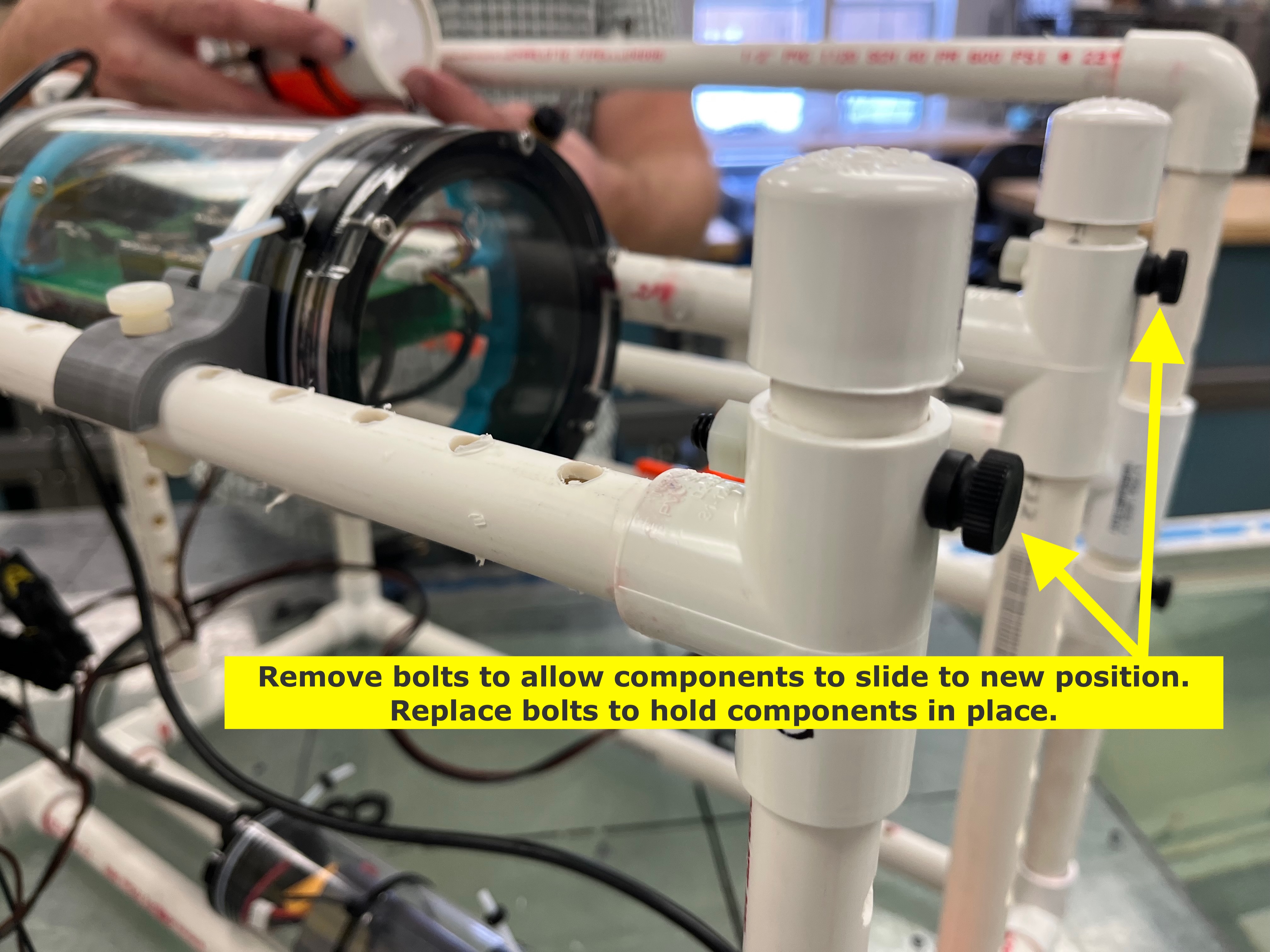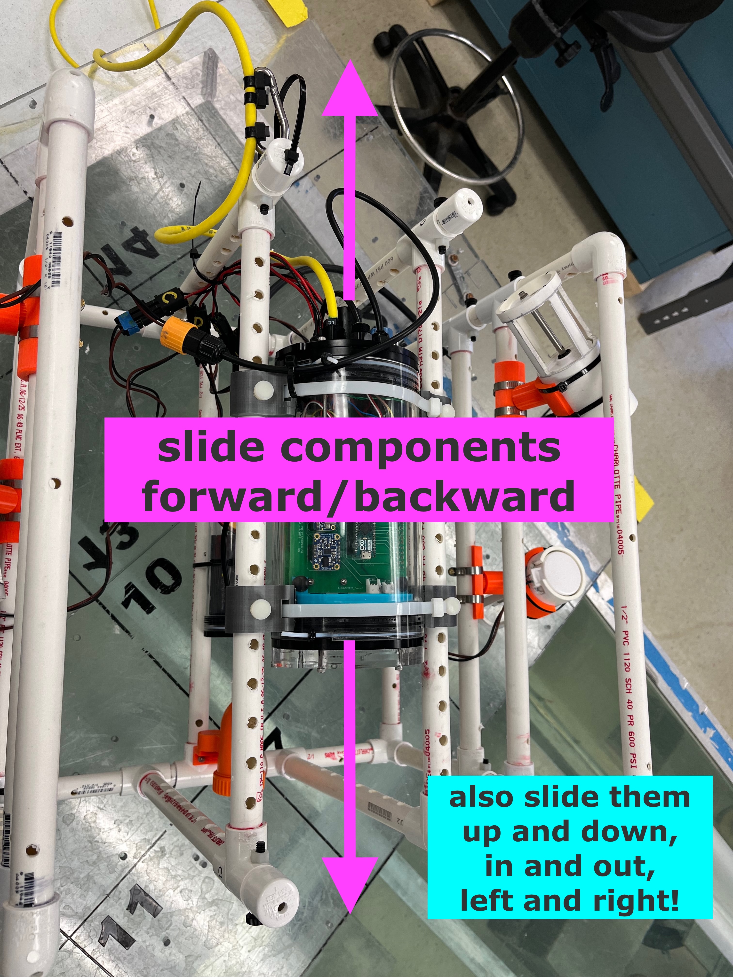In general, you can move around just about anything on this ROV during lab. Don’t forget to move things forward and backward (“fore/aft”) to see how that changes the ROV’s motion, too!
