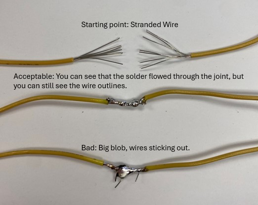 You may also need to use stranded wire to create a connection in your ROV control circuit. Practice creating a joint between stranded wires by twisting the bare ends of the wire together and then applying just enough solder to fill in the gaps around the small wires and smooth out the joint, as show in Fig.