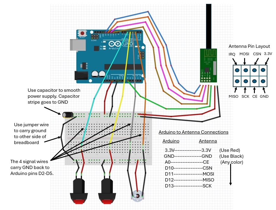 Once you have obtained one switch and two buttons, you will connect the switch and buttons to a breadboard, and then connect the breadboard to the Arduino circuit board. You will then use a nRF24L01 transceiver to wirelessly transmit to an ROV payload to verify that your circuit is complete and functioning correctly. A completed basic control circuit with the ROV payload is shown in Fig. You can use this figure to help guide you through this exercise, but stop and ask Justin or your IA questions whenever you are unsure of what to do! This lab is all about learning as you go! 😊